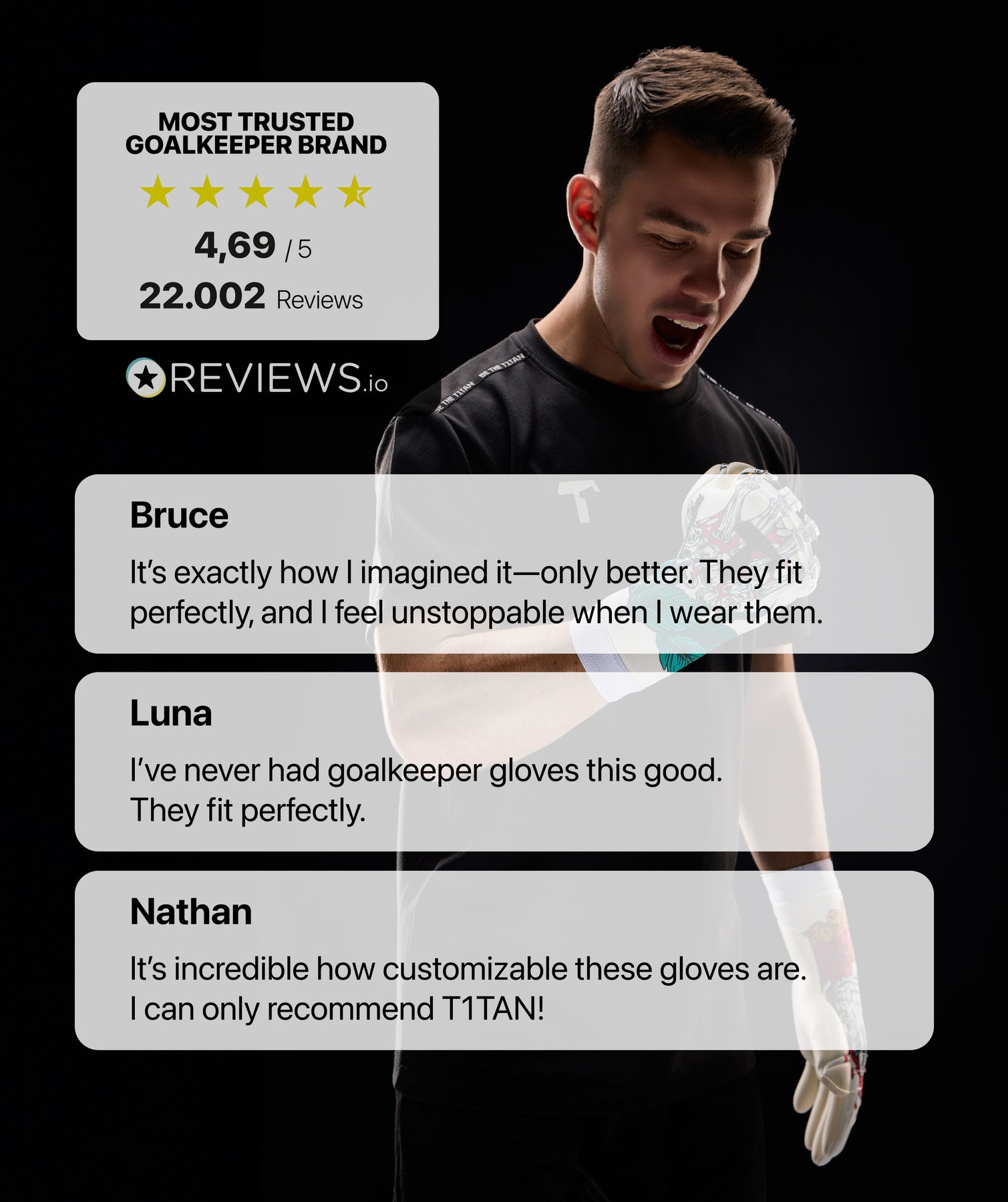 Os profissionais normalmente só utilizam as nossas luvas de guarda-redes durante algumas semanas, uma vez que as exigências a este nível são extremamente elevadas. Na T1TAN, obtém a mesma qualidade que os profissionais.