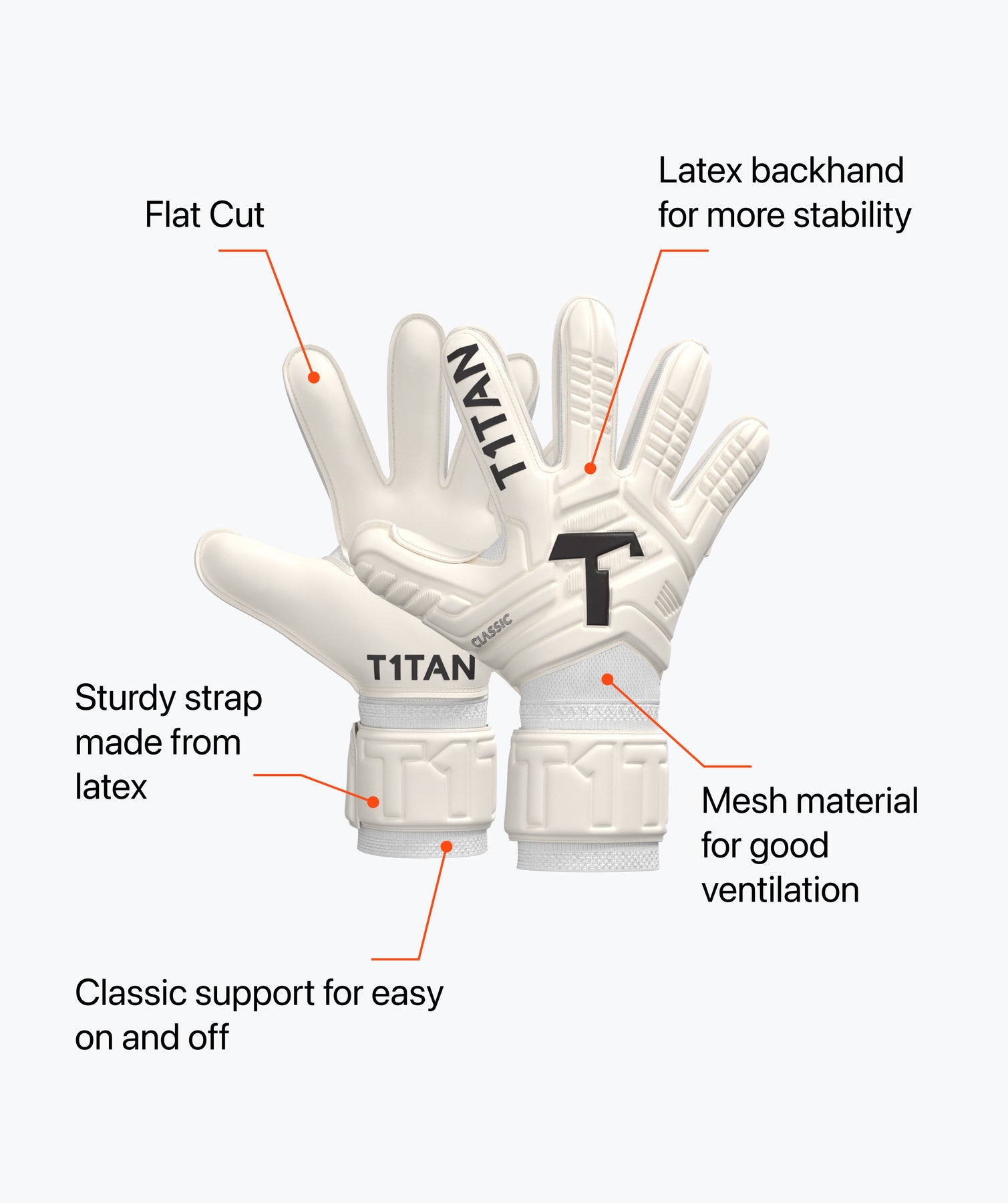 Inspiradas nos nossos melhores modelos profissionais: as luvas CLASSIC 1.0 WHITE-OUT oferecem-lhe uma forte aderência e uma boa resistência à abrasão. Isto torna-as as luvas T1TAN perfeitas para principiantes ambiciosos e jovens guarda-redes exigentes.